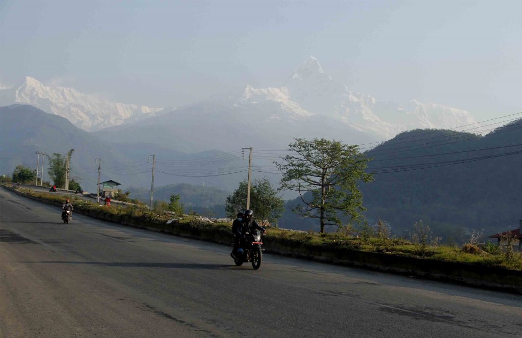 वर्षा पछि सोमबार बिहान खुलेको हिमाल र पोखराको हेम्जामा झुलेको गहुँ । तस्बिर : कृष्णमणि बराल