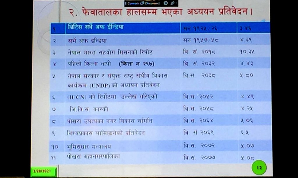 तत्कालीन जिल्ला विकास समितिका सभापति पुण्यप्रसाद पौडेलको संयोजकत्वमा गण्डकी प्रदेश सरकारले फेवातालको सिमाङ्कन प्रतिवेदन तयार पार्न समिति गठन गरेको थियो । समितिले पछिल्लो प्रतिवेदन तयार गरेको हो ।
