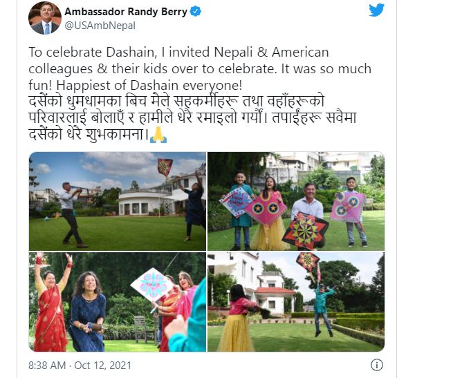 सामाजिक सञ्जालमा चंगा उडाएको तस्बिर राखेर राजदूत ¥यान्डीले दसैं मनाएको बताएका छन् । उनले आप्नो साथीहरु र बच्चाहरु सँग मिलेर चंगा उडाएको उनले सामाजिक सञ्जालमा पाेष्ट गरेकाे तस्बिरमा देखिन्छ । दसै मनाउन उनले नेपाली तथा अमेरिकी सहकमीैहरु र उनका बच्चहरुलाई दूतावास बोलाएको सामाजिक सञ्जालमा लेखेका छन् । समाजिक सञ्जाल मार्फत उनले सबैलाई दसैंको धेरै शुभकामना पनि दिएका छन् ।
