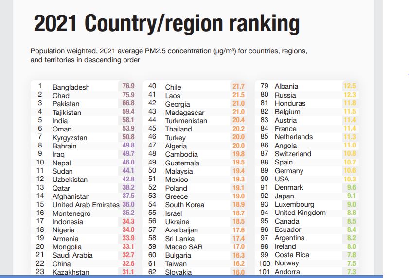 विश्वकै सबैभन्दा बढी प्रदूषित मुलुकको पहिलो सूचीमा बंगलादेश छ भने प्रदूषित सहरमा भारतको राजधानी नयाँ दिल्ली छ । प्रतिवेदनमा विश्वका ११७ मुलुकका विभिन्न ६ हजार ४७५ सहरबाट प्राप्त तथ्यांकलाई आधार तयार गरिरहेको हो । प्रतिवेदनमा एसियाका १ हजार ८८७ सहरमध्ये ४ वटाले मात्रै मापदण्ड पूरा गरेका छन् । दक्षिण एसियामा विश्वका प्रदूषित ५० सहरमध्ये ४७ वटा रहेको प्रतिवेदनमा भनिएको छ ।