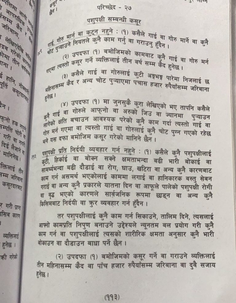 पशुलाई यातना दिएर मार्ने यस्ता घट्नामा फौजदारी कसुर आकर्षित हुने उनले बताए । मुलुकी अपराध संहिता २०७४, मुलुकी फौजदारी कार्यविधि संहिता २०७४ को दफा २९० अनुसार कारबाही हुने प्रावधान रहेको उनले बताए । मुलुकी अपराध संहिताको दफा २९० मा यस्तो अपराध गर्नेलाई तीन महिनासम्म कैद वा पाँच हजार रुपैयाँसम्म जरिवाना वा दुवै हुन सक्ने व्यवस्था छ । यस्ता घटना घटाउँदा समाजमा शान्ति सुरक्षा खलबलिने यस्तो घटना घटाउनेको मनोबल बढ्दै जाने र आम नागरिकको मानसिकतामा नकारात्मक असर पर्ने भएकोले पनि फौजदारी कसुरमा राखेर कारबाही गर्नु पर्ने उनले बताए ।