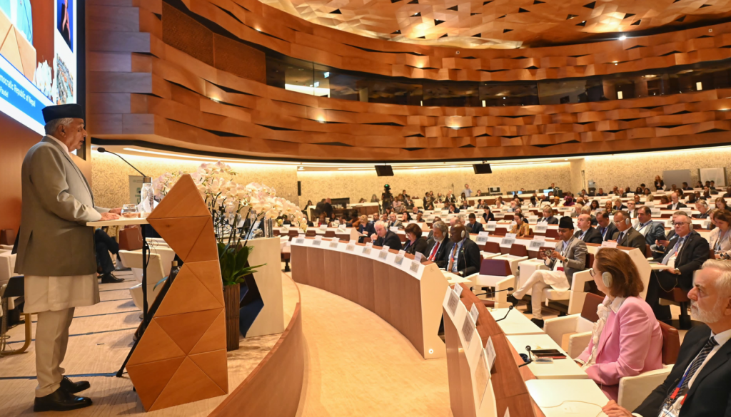 ुहामीले सामाजिक न्यायको कुरा गरिरहँदा विश्वस्तरमा स्थापना गरिनुपर्ने जलवायु न्यायलाई बिर्सन मिल्दैन। जलवायु परिवर्तनका नकारात्मक असरहरूको सन्दर्भमा जलवायु जोखिममा रहेका देशहरूलाई पर्याप्त कोष र आवश्यक प्रविधि उपलब्ध गराएर जलवायु न्याय तुरुन्तै सुनिश्चित गरिनुपर्छ,ु उनले भने। कार्बन उत्सर्जनमा नगण्य योगदान दिए पनि नेपालले जलवायु परिवर्तनको सबैभन्दा खराब असरको सामना गरिरहेको जनाउँदै यसमा नेपालको कुनै दोष नभएको उनको भनाइ थियो। ुपछिल्ला वर्षहरूमा संसारकै सर्वोच्च शिखर सगरमाथालगायत हाम्रा हिमालयहरू आफ्ना हिउँ गुमाउँदै काला पहाडमा परिणत हुन थालेका छन्। हिमनदीहरू अभूतपूर्व परिमाण र गतिमा पग्लिरहेका छन्। जलवायु परिवर्तनले स्वच्छ पानी, बाली, जैविक विविधता र स्वास्थ्यमा गम्भीर असर पुग्नुका साथै लाखौं मानिसलाई गरिबी र असमानतातर्फ धकेलिरहेको छ। जलवायु परिवर्तनबाट सिर्जित विपद्का कारण परिवार, समुदायको विस्थापन र जीविकोपार्जनमा हुने क्षतिले समस्या थप जटिल बनाएको छ,ु सम्बोधनका क्रममा राष्ट्रपति पौडेलले भने।